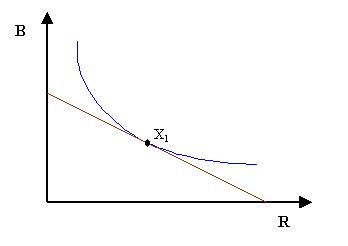 A consumer equilibrium occurs in the graph below at pt. X1, where the (blue) indifference curve is tangent to the (red) budget constraint.