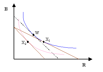 the slope of his original indifference curve equals -1. If R/B = 1 at pt. W, then B = R at pt.