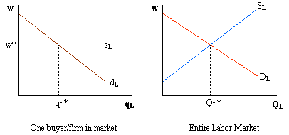 Consider the case where there is one variable factor called labor and that this labor is bought and sold in a competitive labor market. The use of the term competitive designates a situation that is similar to what we would find in a competitive output market. In this case, each buyer of labor is one of many buyers in the market. The labor market determines the wage facing individual buyers, who purchase as many workers as needed at the given wage rate. As a result, the supply of labor facing any individual buyer is a horizontal line at the going wage rate. The graph below shows this.