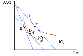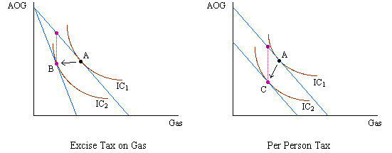 In the case of both tax plans, we can consider the indifference curve graph depicting how the typical consumer makes purchases of All Other Goods (AOG) and Gas. Plan 1 causes a change in the price of gasoline. In the graph on the left, we see that the tax causes the budget constraint to pivot down. As a result, this consumer moves from indifference curve IC1 to the lower indifference curve IC2. The government's tax revenue from Plan 1 is represented by the pinkish (dotted) vertical line between pt B and the upper budget constraint.