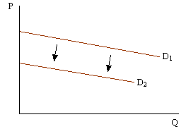 When the price of a close substitute decreases, the demand for this good will decrease. This is because consumers are moving toward purchases of the (now cheaper) substitute. The graph below shows this as a shift in the demand curve (from D1 to D2). Note also, that because this good has close substitutes, the slope of the demand curve is relatively flat.